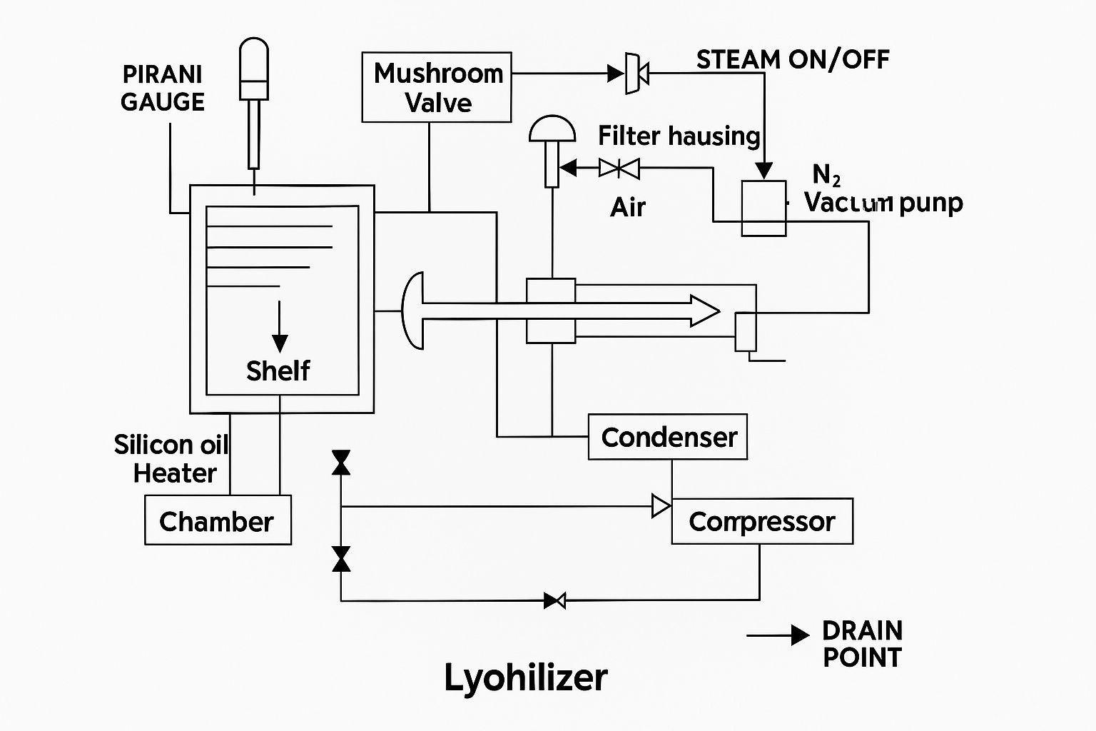 Digital schematic of a freeze-dryer (lyophilizer) with labeled parts including the main chamber with shelves, silicon oil heater, mushroom valve, vacuum pump, condenser, compressor, Pirani gauge, steam/air/Nâ‚‚ inlet, filter housing, and drain point.