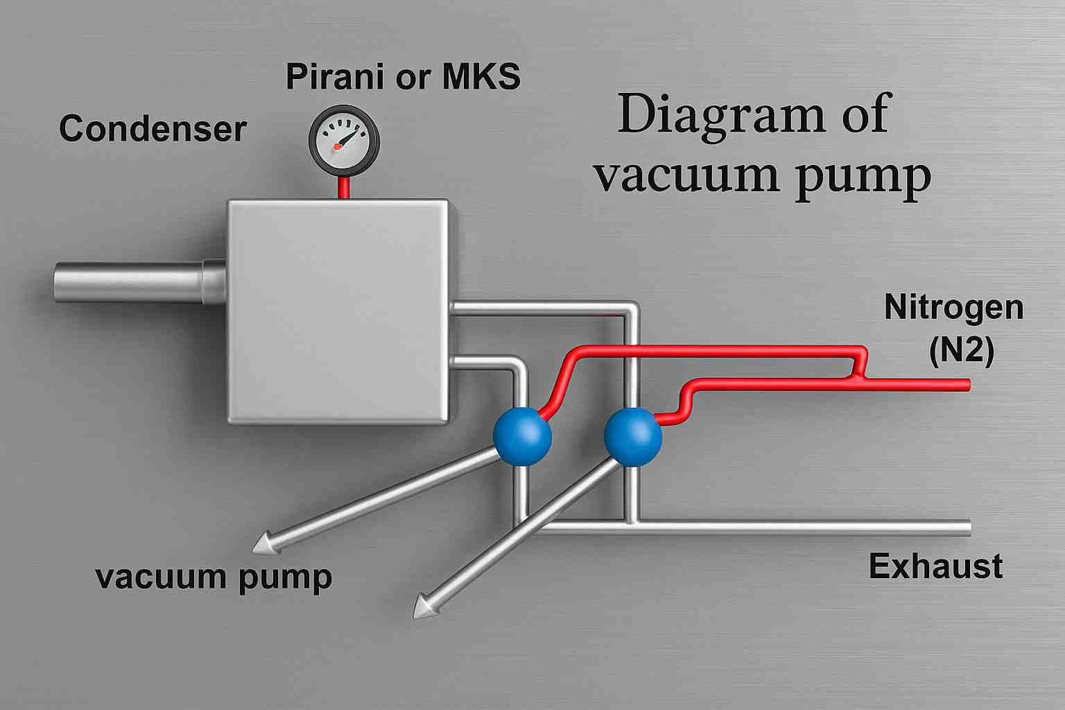 Exhaust → releases gases from the pump. The system creates vacuum, traps vapors, measures pressure, purges with nitrogen, and safely exhausts gases.