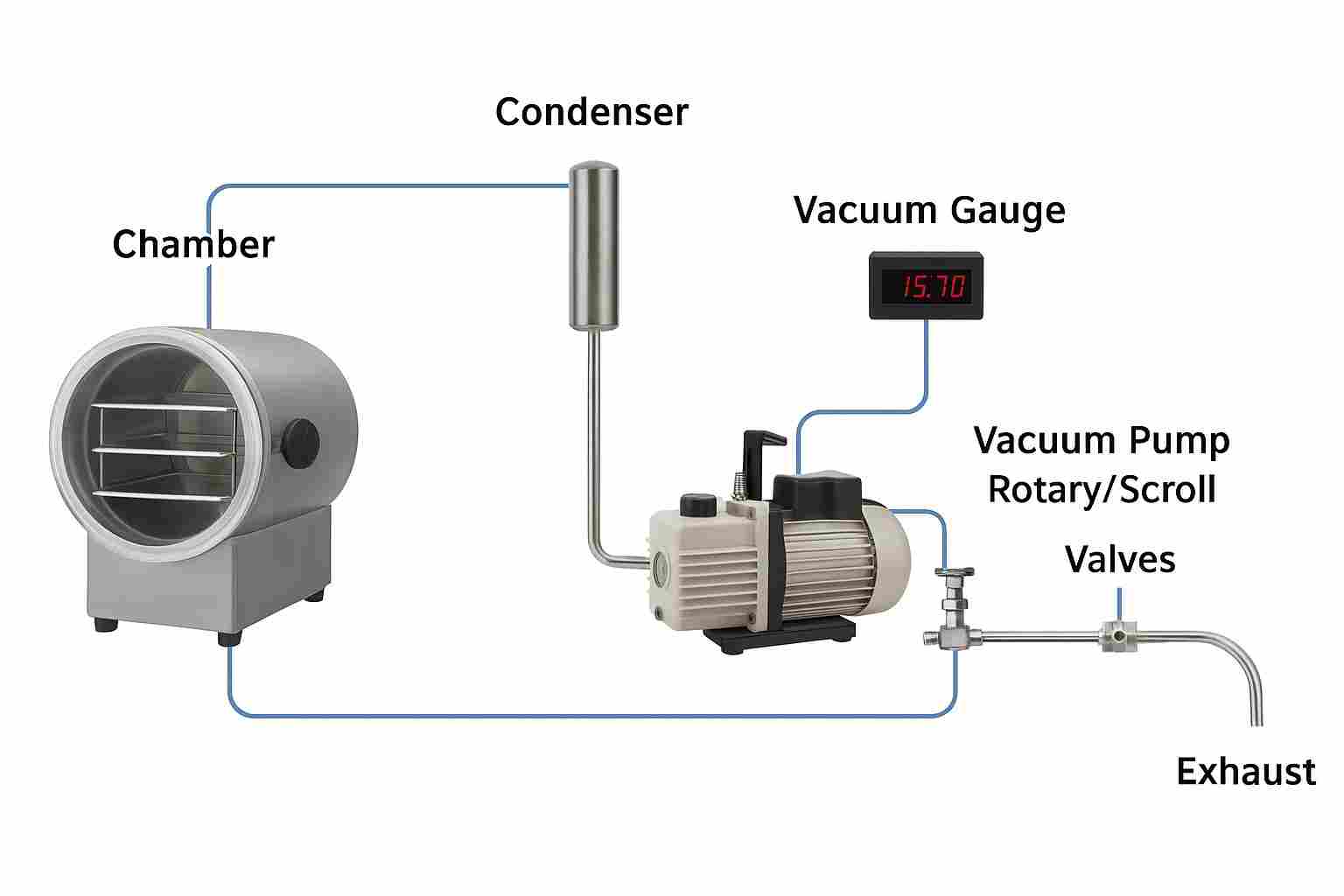 The vacuum pump removes air and gases from the system. By creating a vacuum, it allows sublimation (solid turning to vapor directly), which is very important in freeze-drying (lyophilization) and other vacuum processes.